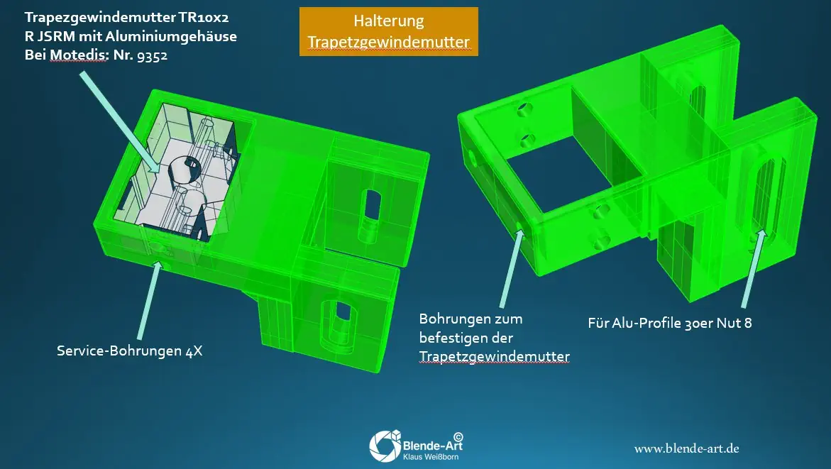 Die verwendete Trapezgewindemutter TR10×2 (Rotguss mit Aluminiumgehäuse) habe ich ebenfalls bei