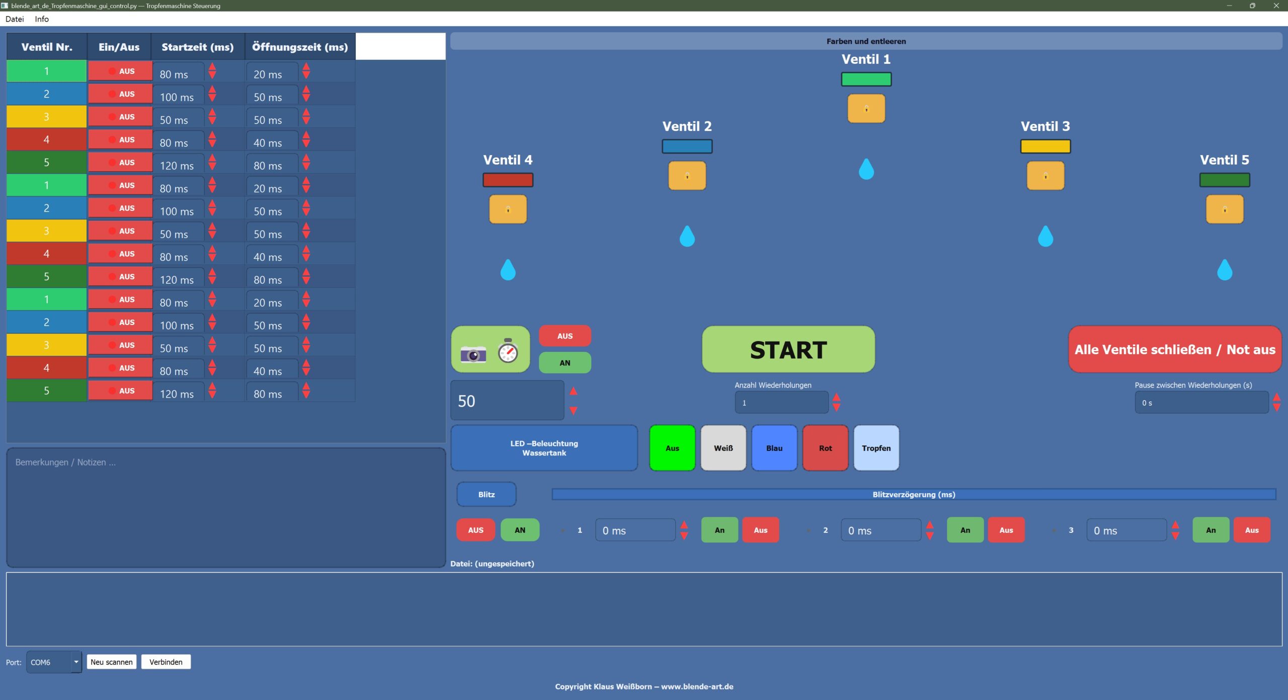 Im folgenden Video zeige ich die Benutzeroberfläche der Steuerungssoftware sowie die wichtigsten Funktionen für Ventil-, Kamera- und Blitzsteuerung.
