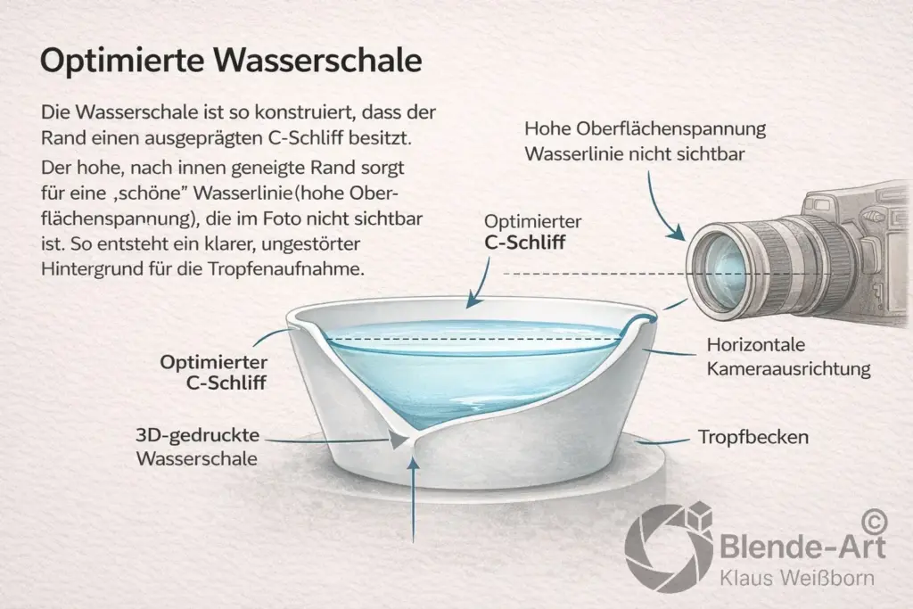Ein entscheidendes Detail bei der Tropfenfotografie ist nicht nur die Tropfensteuerung, sondern auch die Geometrie der Wasserschale.